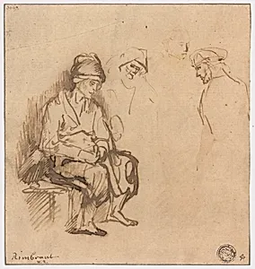 Woman Seated on Bench and Three Sketches of Heads