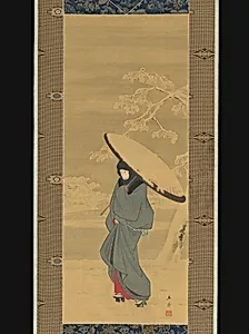 In the serene world of Edo-period Japan (1615–1868), Utagawa Hirosh captures a poignant moment in *Woman Walking in the Snow (1840s–early 1850s). One of the last great masters of uki-e—the "pictures of the floating world" that celebrated everyday beauty and transience—Hirosh here shifts from his famed woodblock prints to a delicate hanging scroll. This intimate format, meant for private display in homes, invites viewers to contemplate a solitary woman braving a snowy path, her wagasa umbrella shielding her from the gentle flurry. Rendered in ink and color on silk (31 1/8 x 12 1/2 in.), the pa...