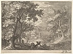 Woodland scene with marshy banks, two men and a dog in profile at left, two-long-necked birds at right, from the series 'Six landscapes in Tyrol' after Roelandt Savery