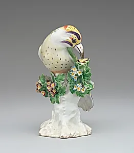 In the mid-18th century, Derby Porcelain Manuf in England produced exquisite small-scale figures like this charming *Woodpecker* (ca. 1765), crafted from soft-paste porcelain. Standing just 5¼ × 3½ inches, this delicate bird captures the factory's mastery of naturalistic modeling, with finely detailed feathers, beak, and perky posture that bring the woodland creature to life. Derby, often linked to the Chelsea-Derby period, rivaled European leaders like Meissen by imitating high-end Chinese and German porcelains while infusing British whimsy. Soft-paste porcelain, a key innovation before true...