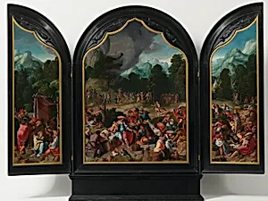 Drieluik met de aanbidding van het gouden kalf. Op het middenpaneel dansen de Israëlieten om het afgodsbeeld van de gouden kalf, links een groep muzikanten. Op de voorgrond zijn families met kinderen op de grond gezeten die eten, drinken en feestvieren. Op de achtergrond is Mozes te zien op de berg Sinaï. Op het linker zijpaneel zitten en staan een groep mensen bij de ingang van een tent, enkelen eten en drinken. Op het rechter zijpaneel zijn meer etende en drinkende personen te zien, links een ...